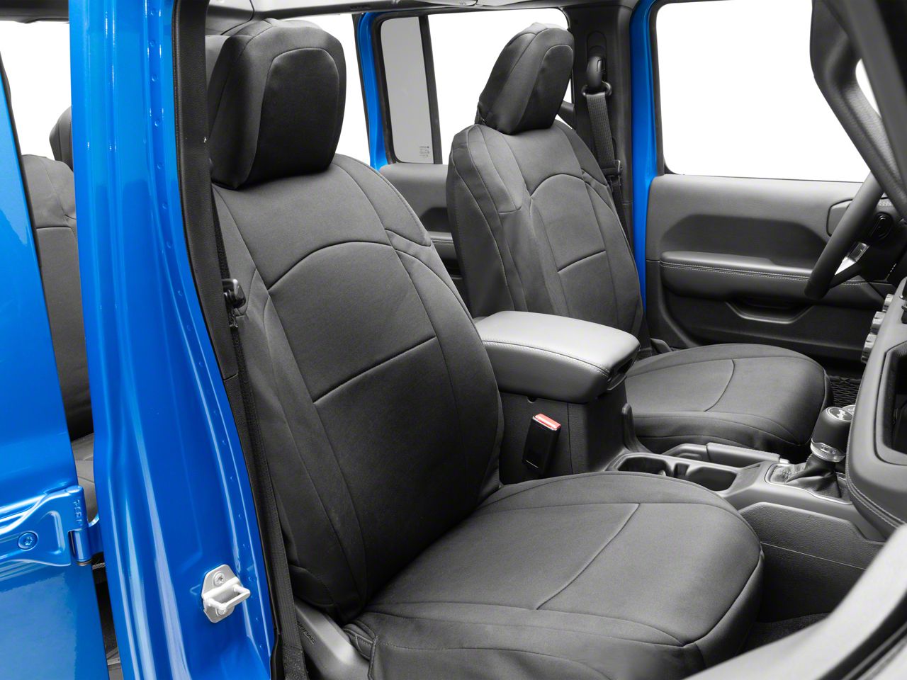 Application. The Hybrid Neoprene Front and Rear Seat Covers; Black fits 2018-2026 Jeep Wrangler JL 4-Door.