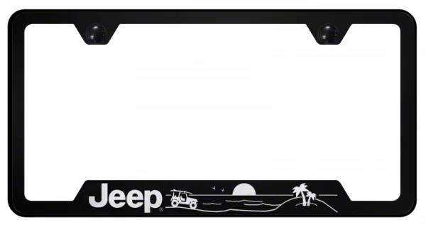 Secure Plate Grip. Get this Jeep Beach Laser Etched Cut-Out Frame and add a cool summer look to your Jeep while also making your license plate more noticeable for urban use. This license plate frame is made of thin yet durable featherweight aluminum steel that has been machine-punched and cut for accurate fitment and measurements, topped off with E-printed Jeep logos for a more authentic and sophisticated look.