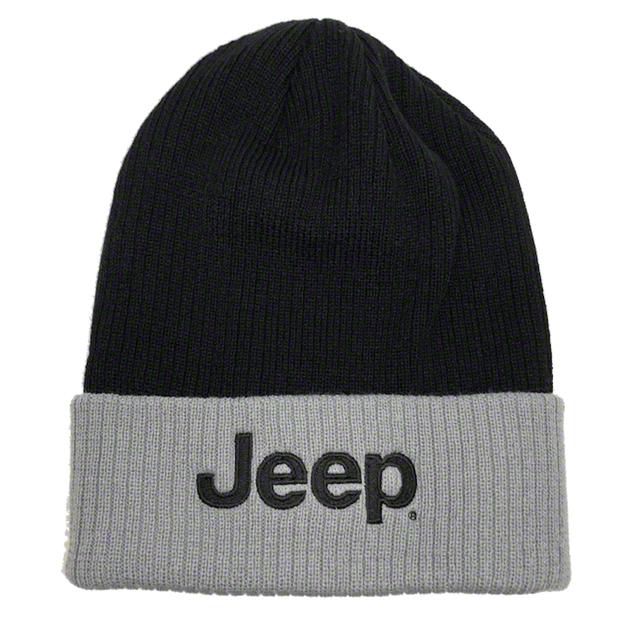 Jeep Themed Knit Hat. Show off your Jeep pride and stay warm with this officially licensed Jeep® Knit Hat. With an embroidered black Jeep® logo on the front, this super soft Hat is knitted from black and grey acrylic yarn. This one size fits most Hat makes a great gift for yourself or the fellow Jeep lover in your life. Sold individually.