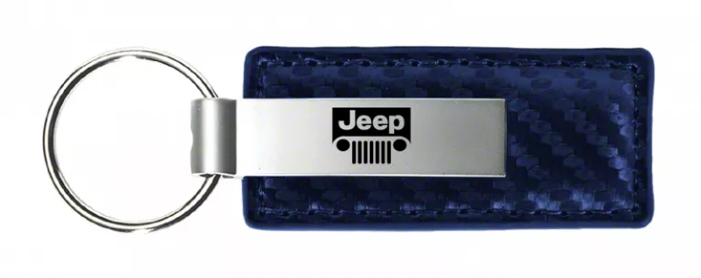 Stylish Key Fob. Flaunt your pride for your favorite vehicle with this Jeep Grille Leather Key Fob in Navy Carbon Fiber. Apart from boasting excellent quality, it also provides a stunning style that is simply eye-catching. Its Jeep Grille logo is laser-etched for precision, while its leather section features a Navy-blue color and a finish that mimics the look of carbon fiber. Without a doubt, this key fob is an accessory that suits every Jeep enthusiast.