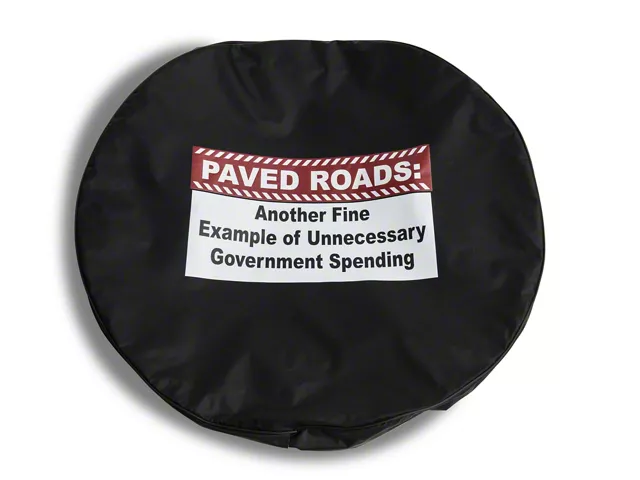 Leveled-Up Fun Factor. Put a smile on your face and on the faces of your fellow off-roaders when you use this Paved Roads Unnecessary Government Spending Spare Tire Cover. This spare tire cover certainly takes the fun factor of your Wrangler up a notch via its graphic that’s a hilarious send-up of off-roading culture. Specifically, this cover’s text says “Paved Roads Another Fine Example of Unnecessary Government Spending” on a graphic that’s rendered like a standard Danger Sign. As funny as this graphic is, this spare cover is all business courtesy of its durable vinyl build.