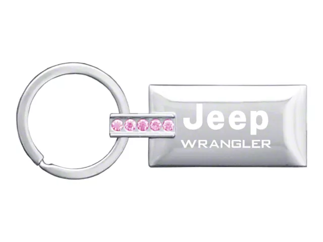 Bright Premium Look. Carry your keys in style and glam with this Wrangler Jeweled; Pink; Rectangular Key Fob. Sporting a strong structure with a flashy silver design, this Fob securely holds your keys together while decorating it with its pink jewel accents.