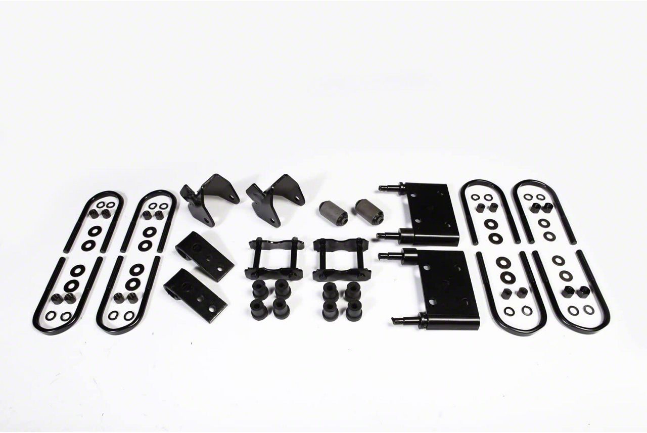 Contains All Hardware Necessary To Mount Front Leaf Springs. Included in this kit is every component required for mounting the leaf springs and front axle to the frame of your Jeep CJ. This includes spring plates, u-bolts, nuts, and hardware, stock-style shackles with rubber bushings, four spring hangers, and main eye bushings.