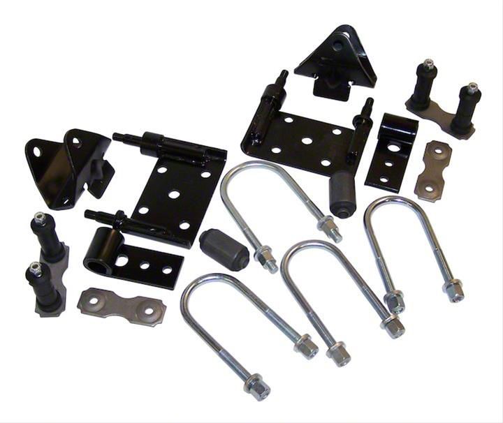 Black and Silver Finishes. The kit features a stylish black and silver finish, adding a touch of sophistication to your vehicle's undercarriage. Whether you're restoring your Jeep or enhancing its suspension system, this Leaf Spring Mounting Kit offers the precision and quality needed for a straightforward installation and reliable functionality. Perfect for Jeep enthusiasts seeking to maintain the integrity and performance of their vehicle.