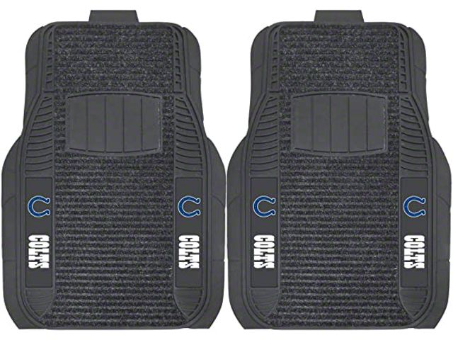 Application. These Molded Front Floor Mats with officially-licensed Indianapolis Colts logo feature a universal design so they will fit most makes and models of vehicles. These Mats can be trimmed to fit if necessary. Sold as a set of two Mats.