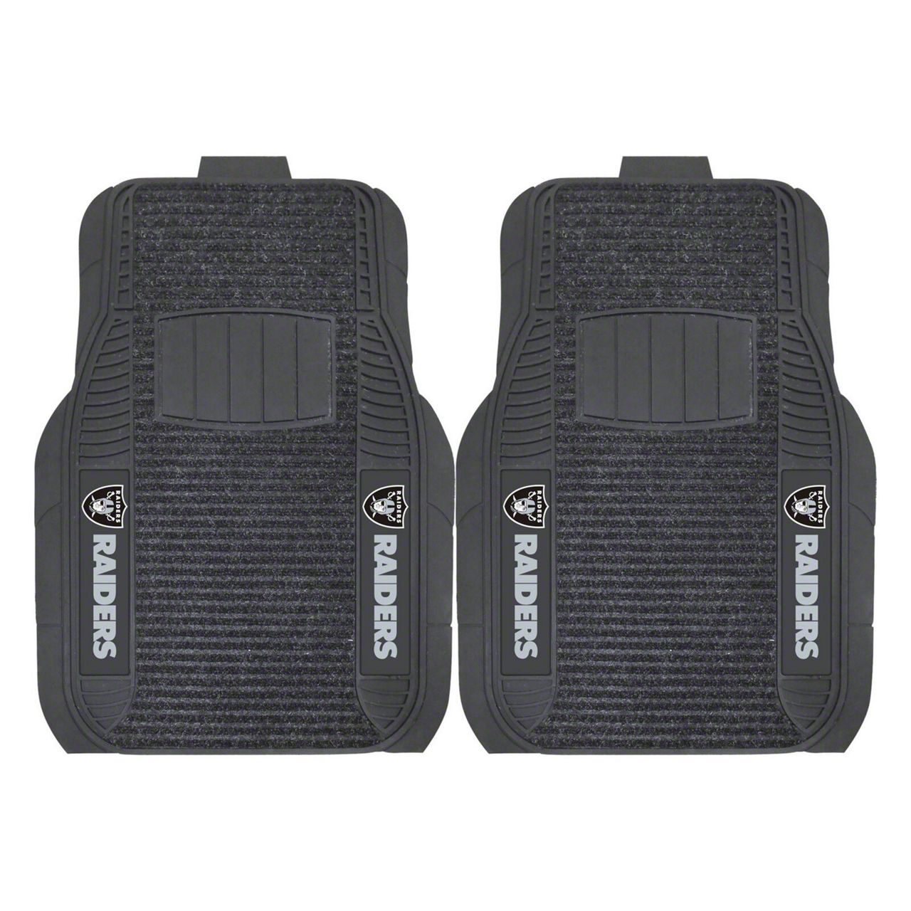 Application. These Molded Front Floor Mats with officially-licensed Las Vegas Raiders logo feature a universal design so they will fit most makes and models of vehicles. These Mats can be trimmed to fit if necessary. Sold as a set of two Mats.