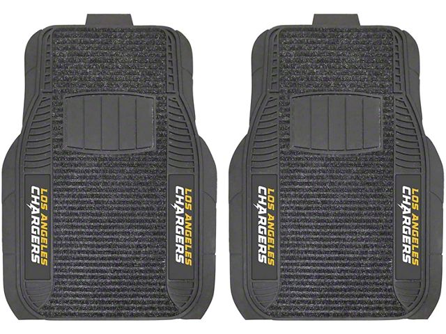 Application. These Molded Front Floor Mats with officially-licensed Los Angeles Chargers logo feature a universal design so they will fit most makes and models of vehicles. These Mats can be trimmed to fit if necessary. Sold as a set of two Mats.
