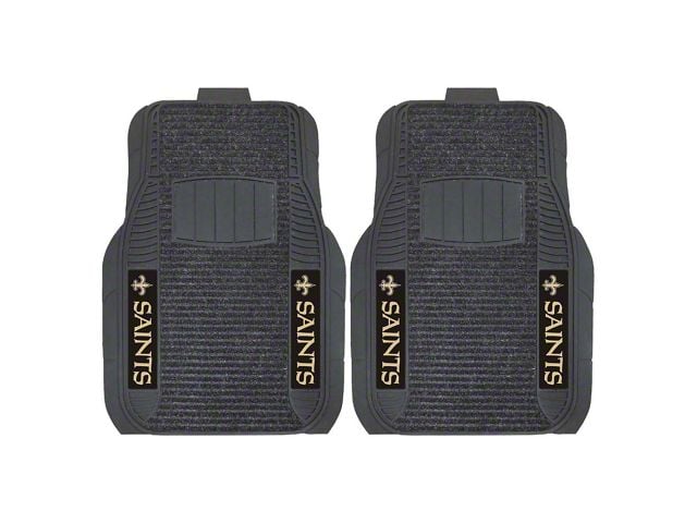 Application. These Molded Front Floor Mats with officially-licensed New Orleans Saints logo feature a universal design so they will fit most makes and models of vehicles. These Mats can be trimmed to fit if necessary. Sold as a set of two Mats.