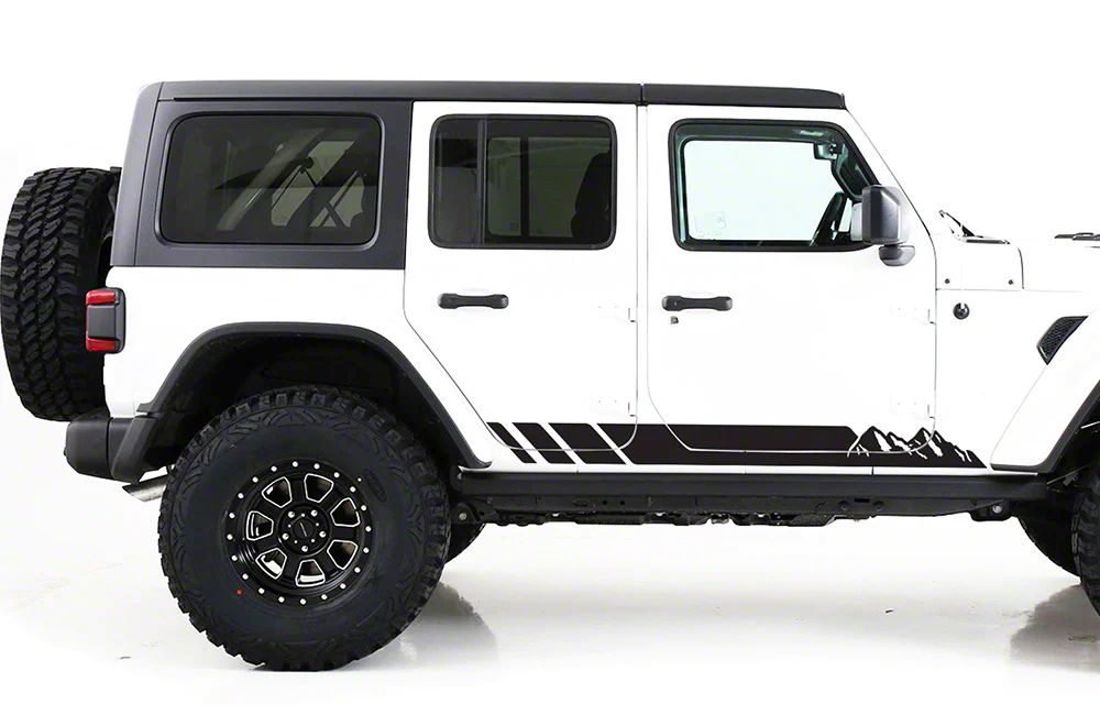 Trail-Inspired Styling Accent. The Mountain Stripes vinyl graphic kit adds a bold and adventurous look to your Jeep Wrangler JL, bringing rugged mountain contours to the body lines. Designed to enhance your vehicle's off-road personality, this kit offers a visual upgrade that stands out on the trail or the pavement.