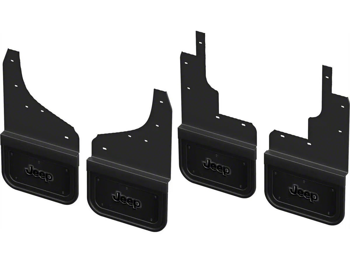Optimal Protection. Equip your 2018 - 2026 Jeep Wrangler JL with a set of heavy-duty Mud Flaps designed to offer supreme protection against mud, rocks, and road debris. Featuring a matte black finish adorned with a distinctive Jeep logo design, these mud flaps are crafted from 1/2 inch thick rubber, ensuring durability and resilience. Ideal for both front and rear application, they enhance your vehicle's appearance while safeguarding its body from damage and dirt.