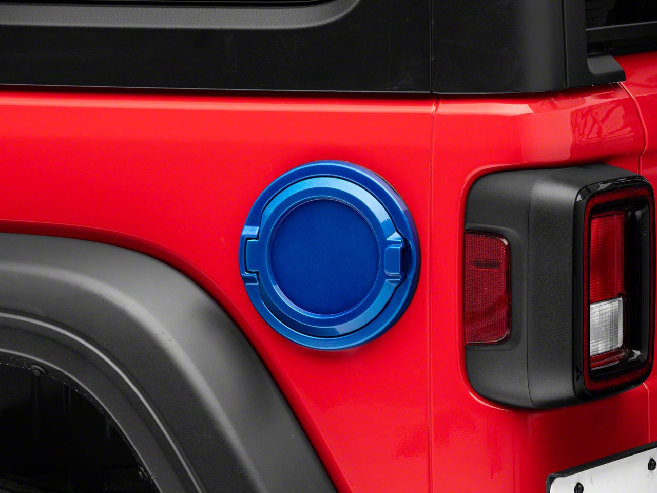 Application. This Non-Locking Fuel Door with Ocean Blue finish is designed to fit 2018-2026 Jeep Wrangler JL models.