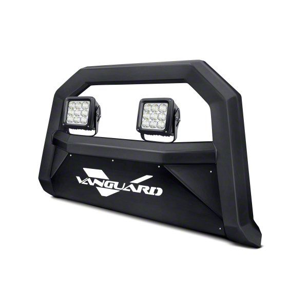 Heavy-Duty Front-End Defense. The Optimus Wide Bull Bar with 4.50-Inch LED Cube Lights (Black) provides enhanced protection and aggressive styling for your Jeep. Designed to shield the front end from trail hazards, this bull bar integrates high-output LED cube lights for superior nighttime visibility, making it an essential upgrade for off-road enthusiasts.