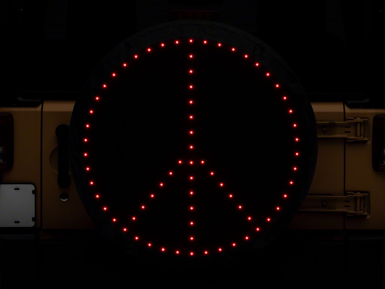 Illuminated Spare Tire Cover. Keep your Jeep's spare tire protected from exposure to the sun and the elements by covering it with a Spare Tire Cover. This Spare Tire Cover features red LED's in the shape of the internationally recognized Peace Sign.