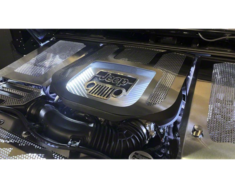 Premium Functional Design. The Perforated Engine Shroud with Jeep Logo is expertly constructed with high-quality stainless steel, ensuring durability and longevity. The black carbon fiber vinyl inlay adds a sleek and sporty look, enhancing the overall aesthetics of your engine compartment. The brushed finish gives it a refined and polished appearance. Engineered with white LED lights, this shroud illuminates your engine bay, creating a captivating visual effect.