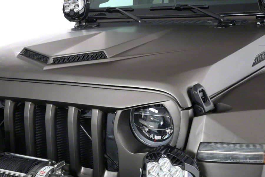 Cost-Effective. It uses your Jeep's stock latches and hinges, further simplifying the mounting process and saving you from unnecessary expenses. One standout feature is its functional scoop adorned with distinct diagonal lines, enhancing not only the vehicle's aerodynamics but also its aggressive off-road aesthetics.
