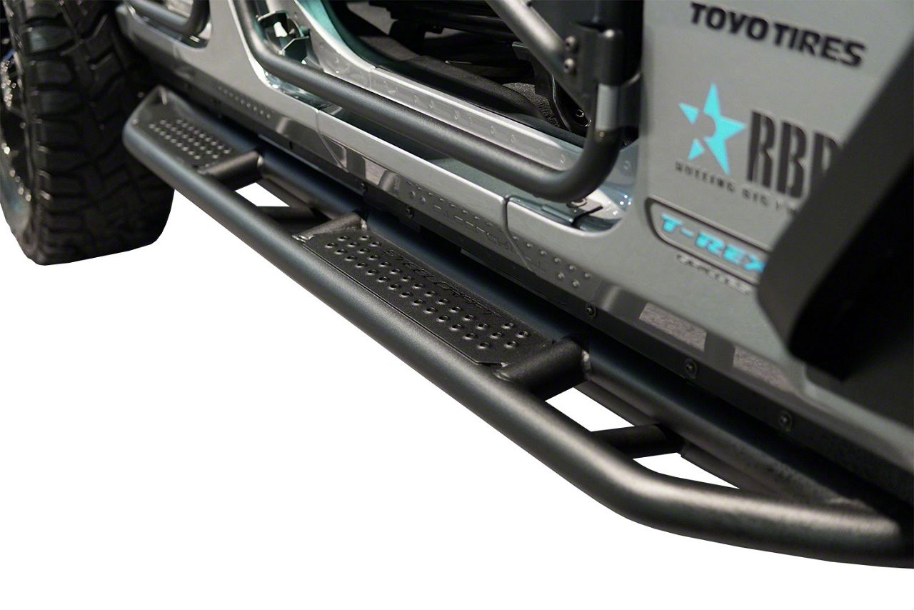Maximum Protection and Easy Access. If you're looking to equip your Wrangler JL with exceptional rocker panel protection that also offers easy cab access then these Rocker Armor Steps in Fine Textured Black are just what you need. These rocker panel steps combine an all tubular steel construction with a trussed design that makes these components extremely strong. This design offers your Jeep's rocker panels with the protection it needs for more aggressive off-roading like rock crawling. Meanwhile, these assemblies come equipped with stepping platforms made from high traction reverse punch plate steel, ensuring easy access. What's more, these rocker armor steps feature an all-black color scheme, giving your vehicle a rugged style accent that's sure to make it stand out.