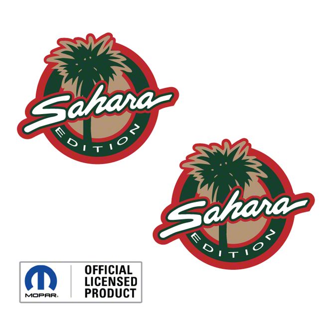 Bold Accents for a Custom Look. Spruce up the look of your Wrangler by adding this set of Sahara Round Side Logo in Red, Green, and Tan on your side fender. This decal set displays palm tree and “Sahara” lettering in red, green, and tan hues that appealingly add a stylish appeal to your rugged Jeep. Moreover, each decal will make your vehicle stand out with its distinctive design.