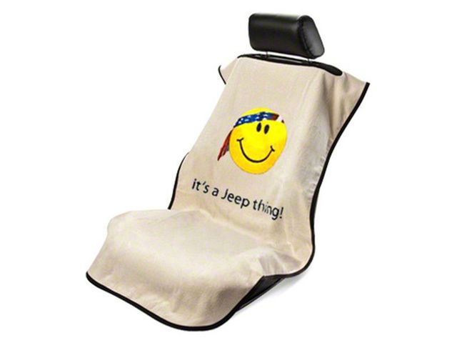 Protected and Stylish Interior. Protect your Jeep Wrangler’s valuable upholstery to resist wear and tear due to pet scratches, damaging debris, staining liquids, or sweat. Using this Seat Cover with Jeep Smiley Face in Tan will provide your vehicle’s covered seat with an extra layer of protective sheath. This seat cover is perfect for interior protection, especially after workouts, sports, and other adventures or when traveling with kids and pets.