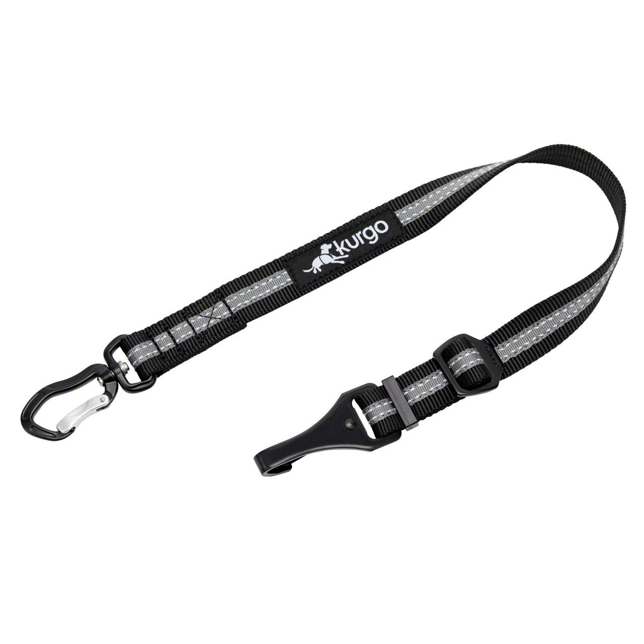 Construction and Appearance. Made from a durable black and charcoal fabric, the tether is built to withstand wear and tear. The high-strength aluminum carabiner adds extra durability and ensures tangle-free mobility, allowing your dog to sit or lie down comfortably during trips.