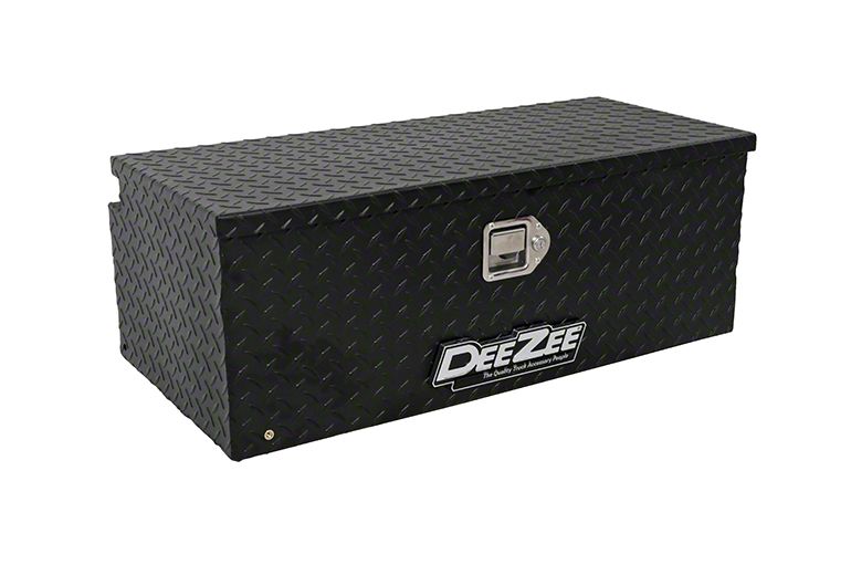 Description. Dee Zee Tool Box -Jeep boxes. Constructed of heavy duty Brite-Tread aluminum. Texture black powder coat, provides a matte black finish while it protects and prevents oxidation. Crown style lid with a full pan double-V stiffener for superior rigidity. Convenient side handles for easy transport. Other features: lockable stainless steel paddle handles, dampened gas shocks, closed cell foam gasket, and self-adjusting strikers. Removable plastic tool tray to help keep small items organized.