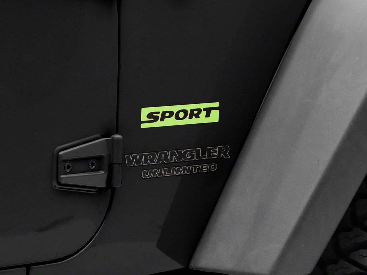 Application. This Jeep Licensed by RedRock Sport Side Logo; Lime Green is designed to fit 1987-2018 Jeep Wrangler YJ, TJ and JK models. Sold individually.