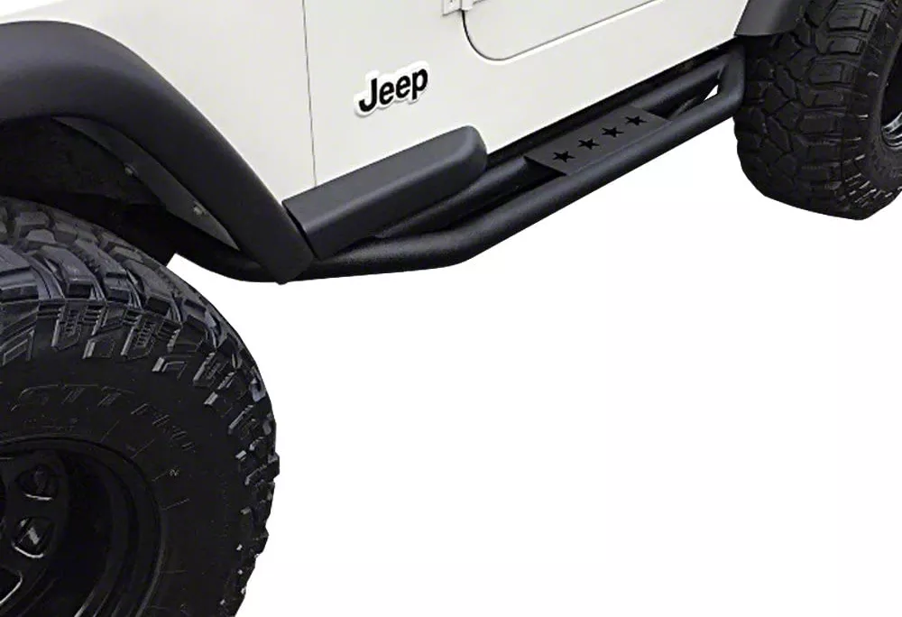 Step Up with Confidence. Upgrade your 1987-2006 Jeep Wrangler YJ and TJ, Excluding Unlimited with the Star Armor Side Step Bars in textured black. These step bars provide a reliable, safe step to help you and your passengers enter and exit your vehicle easily, especially in lifted trucks.