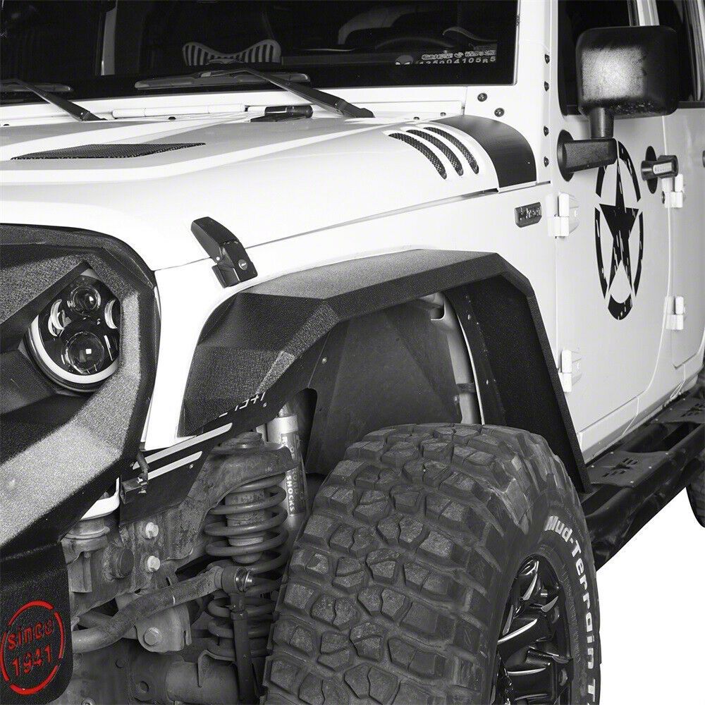 Application. These Steel Flat Front Fender Flares are intended for use with models of Jeep Wrangler JK built between 2007-2018.