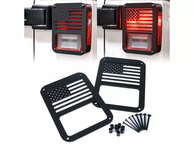 Patriotic Style and Tail Light Protection. The Tail Light Covers featuring the US Flag design are crafted to provide both protection and style for your 2007-2018 Jeep Wrangler JK. These covers display a patriotic US Flag design, adding a unique and personal touch to your vehicle. The precision engineering ensures an exact fit, making them a reliable replacement for factory covers.