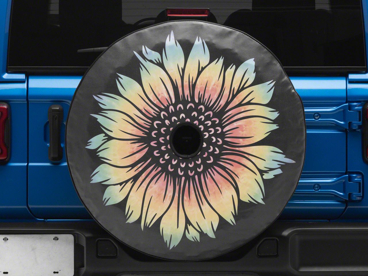 Application. This Tie Dye Sunflower Spare Tire Cover with Camera Cutout fits all 2018-2026 Jeep Wrangler JL Models.