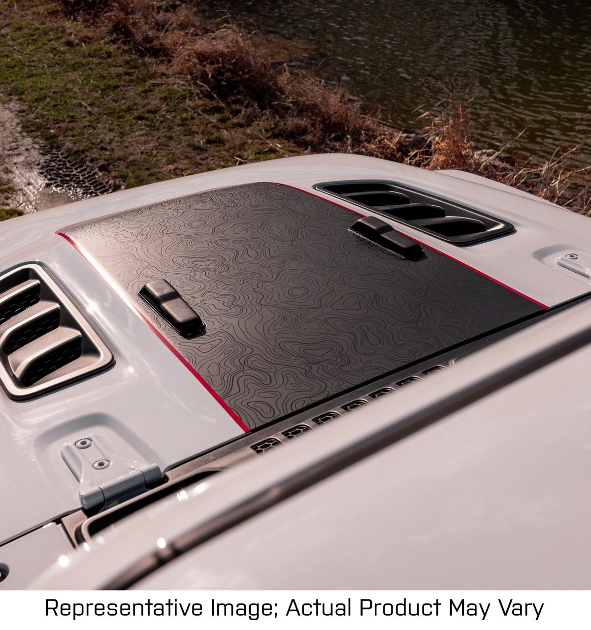 Travel-Inspired Decal. Accentuate your hood with a reminder of your adventure-loving spirit with the Topographic Map Hood Graphic in Black with a Red Outline. This hood graphic decal has a distinctive topographic map design that will always inspire you to go out and explore the wild. Additionally, this decal covers any imperfection you might have on your hood and prevent future damage.