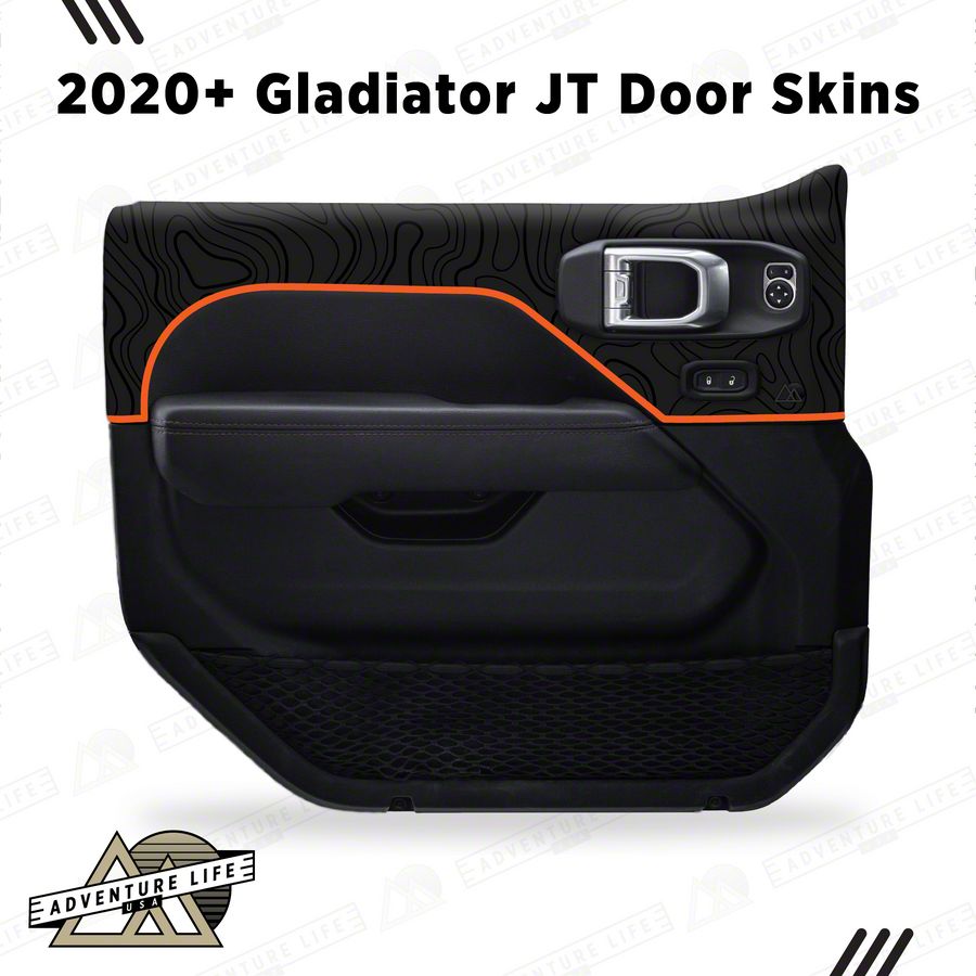 Application. The Topographic Map Interior Door Skins; Front and Rear; Black with Orange Outline fit 2018-2026 Jeep Wrangler JL 4-Door models with Power Windows & Locks.