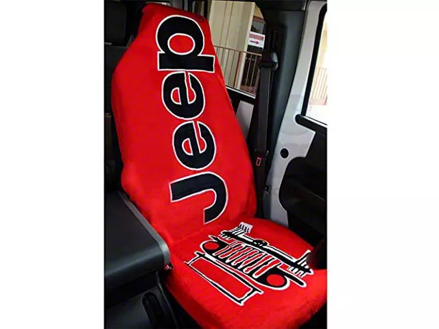 Premium Construction. This Towel 2 Go is made from high-quality cotton terry/velour fabric with a soft feel. This material serves as an effective barrier to help further protect the covered seat. It also comes in an appealingly striking red fabric that features a bold Jeep logo for a stylish and aggressive look. In addition, it is furnished with durable grommets and a carabiner clip for a secure attachment to your seat.