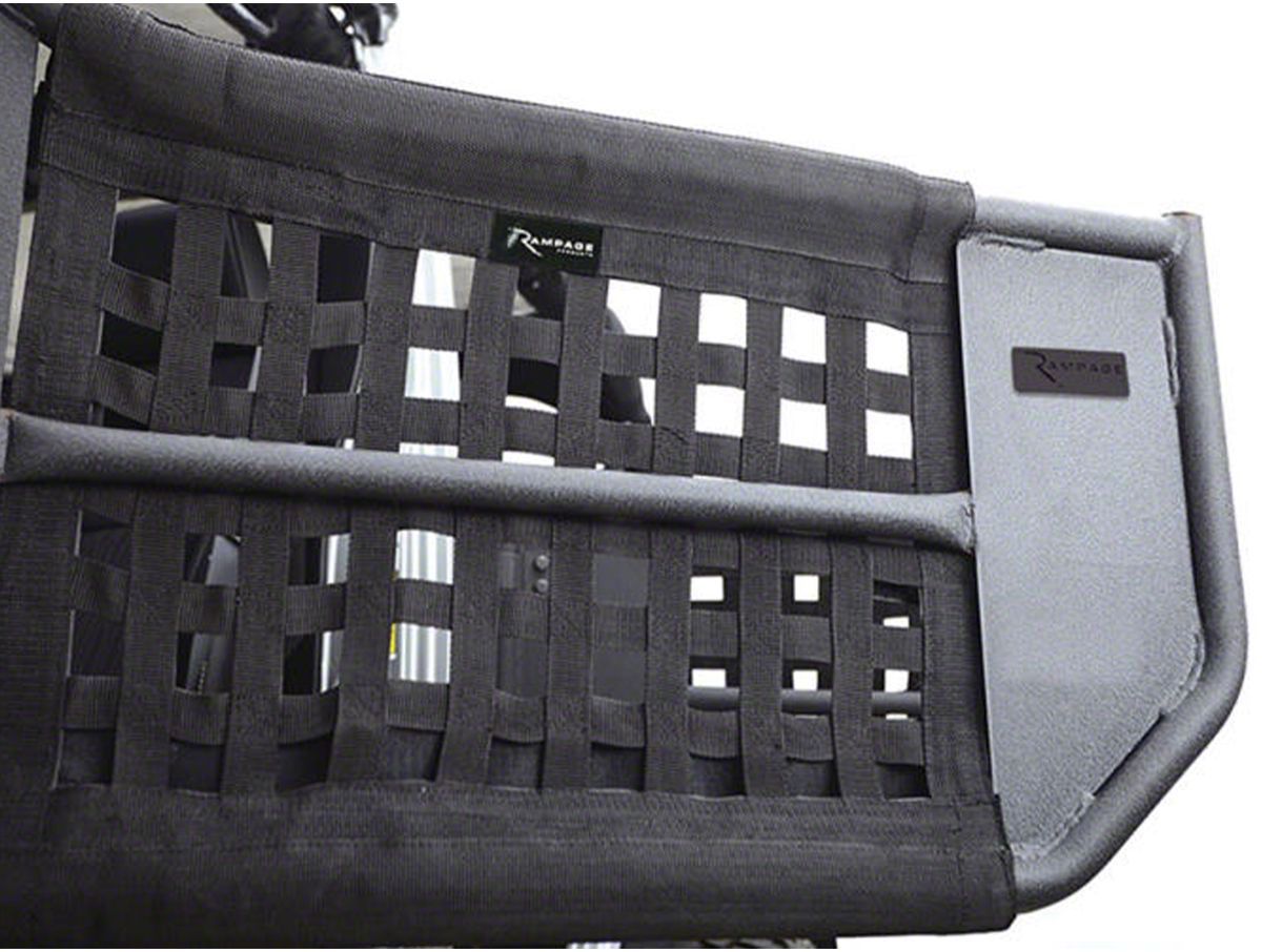 Safari-Style Doors. Rampage Jeep Wrangler Trail Doors with Removable Mesh Net are the ultimate addition to your journeys. These doors scream adventure, constructed from durable steel tubing and featuring removable netting. They improve the road visibility, helping you to avoid obstacles off-road, and let you breathe fresh summer air while driving. These doors are the perfect blend of the protection and freedom you need.
