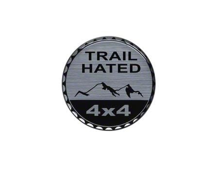 Appearance. This circular badge features "TRAIL HATED" in black with a mountain range underneath. That section has a silver backing, while "4x4" is in silver below the mountains with a black backing.