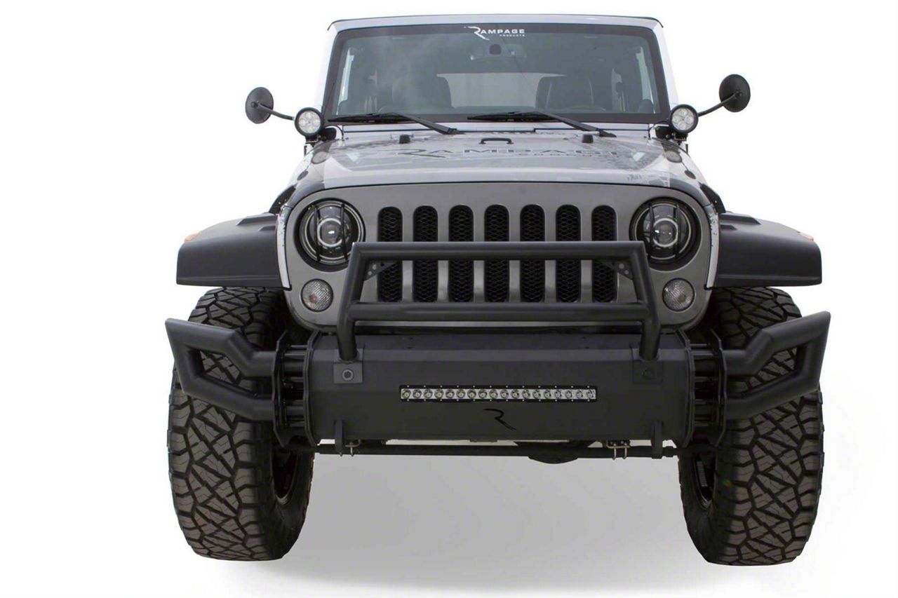 Description. Rampage TrailRam modular bumpers permit you to customize the look and functionality of your bumpers for any purpose! Constructed from thick 3/16 in. steel and finished with a textured black powdercoat, TrailRam modular bumpers are ideal for high-travel suspensions and tight approach angles. The front bumpers feature centerpiece stubby with 3 in. welded ends and integrated LED light bar. Adding rear Rampage TrailRam modular bumpers will complete the look of your rig and provide enhanced functionality. Both use factory mounting points for easy installation and are backed by a five year limited warranty. Also, Rampage offers optional front bumper bolt-on side pieces, center bull bar, and winch plates, as well as an optional spare tire extender for the rear to create your own look and suit your needs.