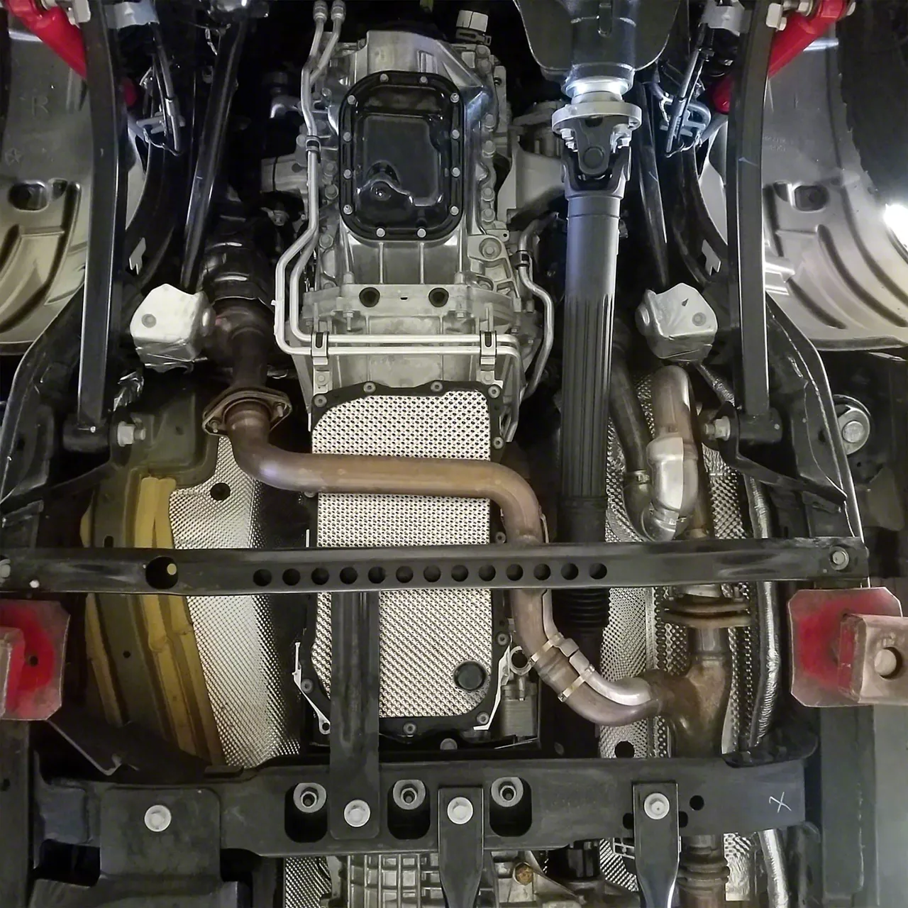 Adhesive backed transmission pan heat shield installs between the transmission pan and cross over pipe on JL Wranglers & JT Gladiators with 850RE 8 speed transmissions. It blocks radiant heat from the exhaust, preventing heat soak into the transmission pan and fluid. The result—cooler transmission temps, improved performance, and longer component life.