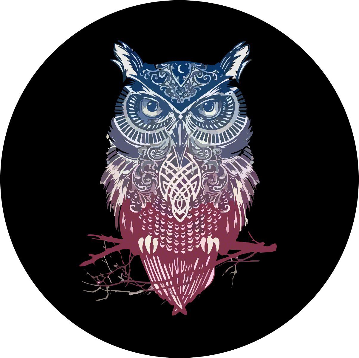 Stylish and Functional Spare Tire Protection. The Tribal Owl Spare Tire Cover with Camera Cutout combines functionality with a custom aesthetic, featuring a striking tribal owl design. This cover not only protects your spare tire but also integrates seamlessly with your Jeep Wrangler JL's factory backup camera.