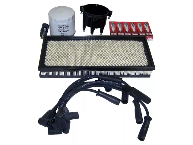 All-Inclusive Kit. This Tune-Up Kit includes everything necessary to spruce up your Jeep 4.0L ignition system, including six new spark plugs, spark plug wires, and a new cap and rotor. Additionally, this kit includes a new factory-style air filter and oil filter.