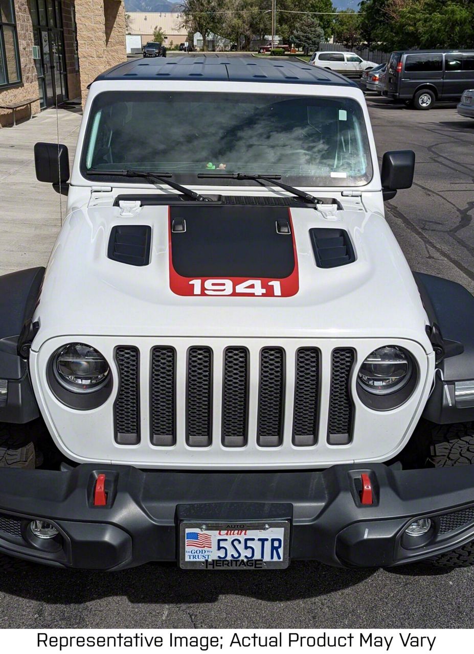 Historic and Stylish Design. Prominently featuring the year 1941, this V3 Hood Stripe with 1941 Logo fits your Jeep Wrangler JL Rubicon model. With a matte black and red highlight finish, this hood stripe has the numbers 1941 in pure white front and center on your hood for a unique sense of style, celebrating the introduction of the Jeep into US military service.