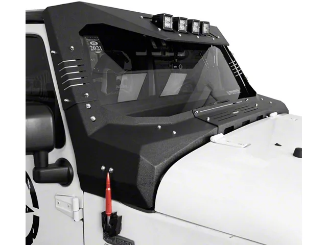 Integrated Light Pocket. Added visibility is a welcomed addition to any Jeep, and this windshield frame cover armor doesn't disappoint. This product features an integrated pocket centered above the front windshield loaded with (4) 18-W LED spot cubes, providing additional light for improved low-light visibility.Â