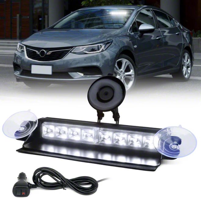 Premium Emergency Lighting. The Windshield Strobe Light with Suction Cups; White provides bright and highly visible strobe lighting for emergency and hazard situations. This compact light bar is designed to mount easily on either front or rear vehicle windows with durable suction cups, offering enhanced safety and visibility for responders, security personnel, and construction crews.