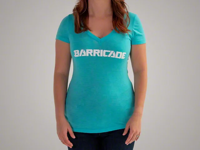 Barricade. Let everyone know whose parts you're running on your rig with a Barricade V-Neck T-Shirt. This bold teal short-sleeved women's V-Neck features the Barricade logo across the front in bright white lettering.