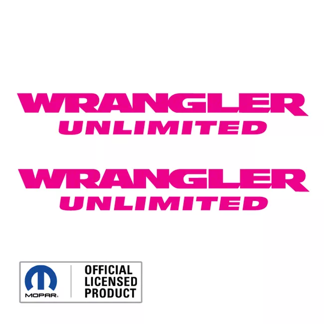 Design. The set includes a tiny but eye-catching hot pink WRANGLER UNLIMITED Small Side Logo that was created especially for Jeep Wrangler JKs. This vivid color gives your vehicle a distinctive, customized touch and makes it stand out with its vivid, bold look.