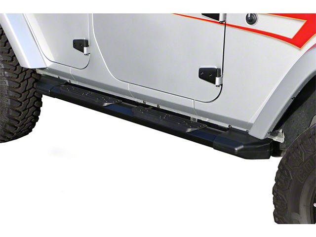 Sturdy Construction. According to Rampage Products, the Jeep Wrangler Xtremeline Side Step Bars have the strength of a running board. They’re 70 Inches long, and they have a semi-gloss black finish. Made from heavy-duty steel, these side step bars are built to last. They can also be painted for a custom finish. The mounting brackets aren’t included.