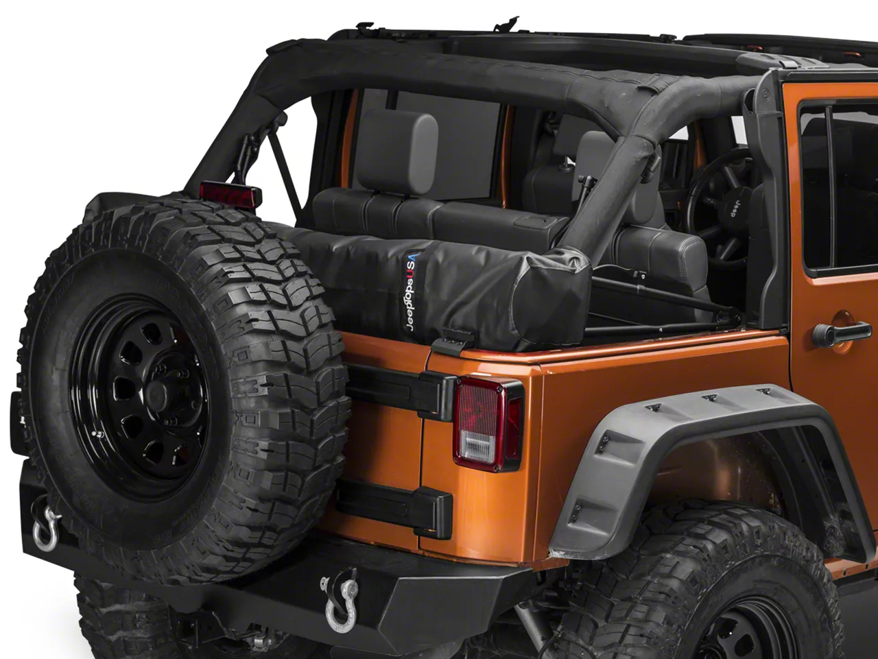 Stylish Storage. Stow your Wrangler's folded soft top in style with the Jeep Tops USA Soft Top Boot in Black. Custom designed for JKU soft tops, this easy to use storage boot will create a cleaner look when your top is folded back. Engineered to work with both premium and standard OEM tops, this boot's unique design will provide a reliable fit as well as extra protection from dust, mud or other messy conditions you may encounter off or on road.