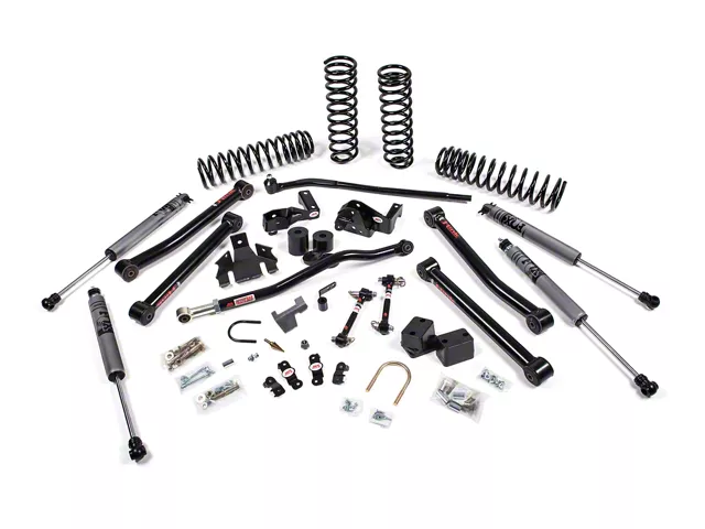 Tuned Gas Shocks. With incorporated sway bar quicker disconnects, a J-Link lower control arm, and dual-rate coil springs, your Jeep will be ready to tackle any terrain. The tuned gas shocks provide optimal damping for a comfortable and controlled driving experience.