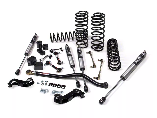 Construction and Appearance. Featuring a combination of polished chrome and glossy black finishes, this kit includes heavy-duty rate coils and Jspec shocks for durability and ride quality. The adjustable front track bar and rear track bar bracket help maintain proper suspension geometry.