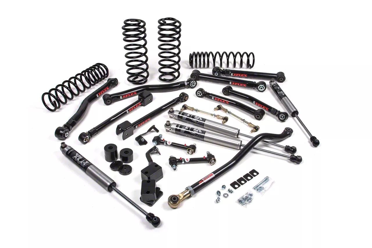 From hardcore rock crawling to high-speed desert, the J-Krawl 3.5" Lift System brings a level of performance and adjustability that makes it the go to package for many Jeep enthusiasts. These systems build on the base systems and add comments for a full overhaul of the factory suspension to maximum articulation, strength and allow for adjustability. Components include J-Flex upper and lower control arms, Jspec dual rate coil springs, an adjustable front track bar, a rear track bar bracket, quicker disconnect front sway bar end links, and bump stop extensions. This particular kit features next level performance from the FOX 2.5 Performance Elite Series shocks with DSC adjustment to deliver next level performance with easy adjustment to dial in high-speed/low-speed compression damping for improved performance across off terrains. J-Krawl builds off Jeep’s factory suspension mounting points and upgrades everything front to rear. Adjustability is important for fine tuning suspension geometry. J-Krawl delivers. Dial in front caster, rear pinion and overall vehicle wheelbase. Take your Jeep's off-road performance and strength to the next level. It should be noted that an aftermarket front driveshaft is strongly recommended due to potential additional travel.