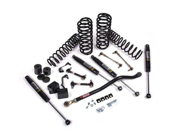 Construction and Features. This suspension lift kit features durable dual-rate coil springs and monotube Jspec shocks, providing improved ride quality and handling. The glossy black and matte black finish ensures resistance to wear and corrosion, while the included adjustable front track bar, quick disconnect sway bar end links, and caster cam alignment correctors contribute to precise control and stability. Its robust design is tailored for heavy-duty use, making it a reliable choice for demanding terrains.