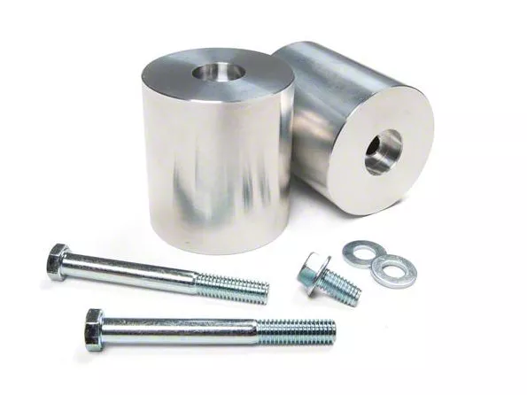 Installation. The JKS Manufacturing 3-inch Aluminum Front Bump Stop Extension Kit bolt-on installation directly onto the existing mounting points; no drilling is required.